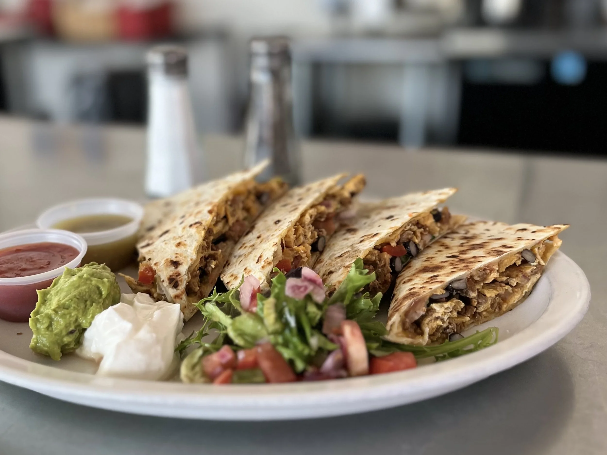 Two eggs, chorizo, cheese, mixed beans, onions, peppers, guacamole, sour cream, pico de gallo, with choice of salsa