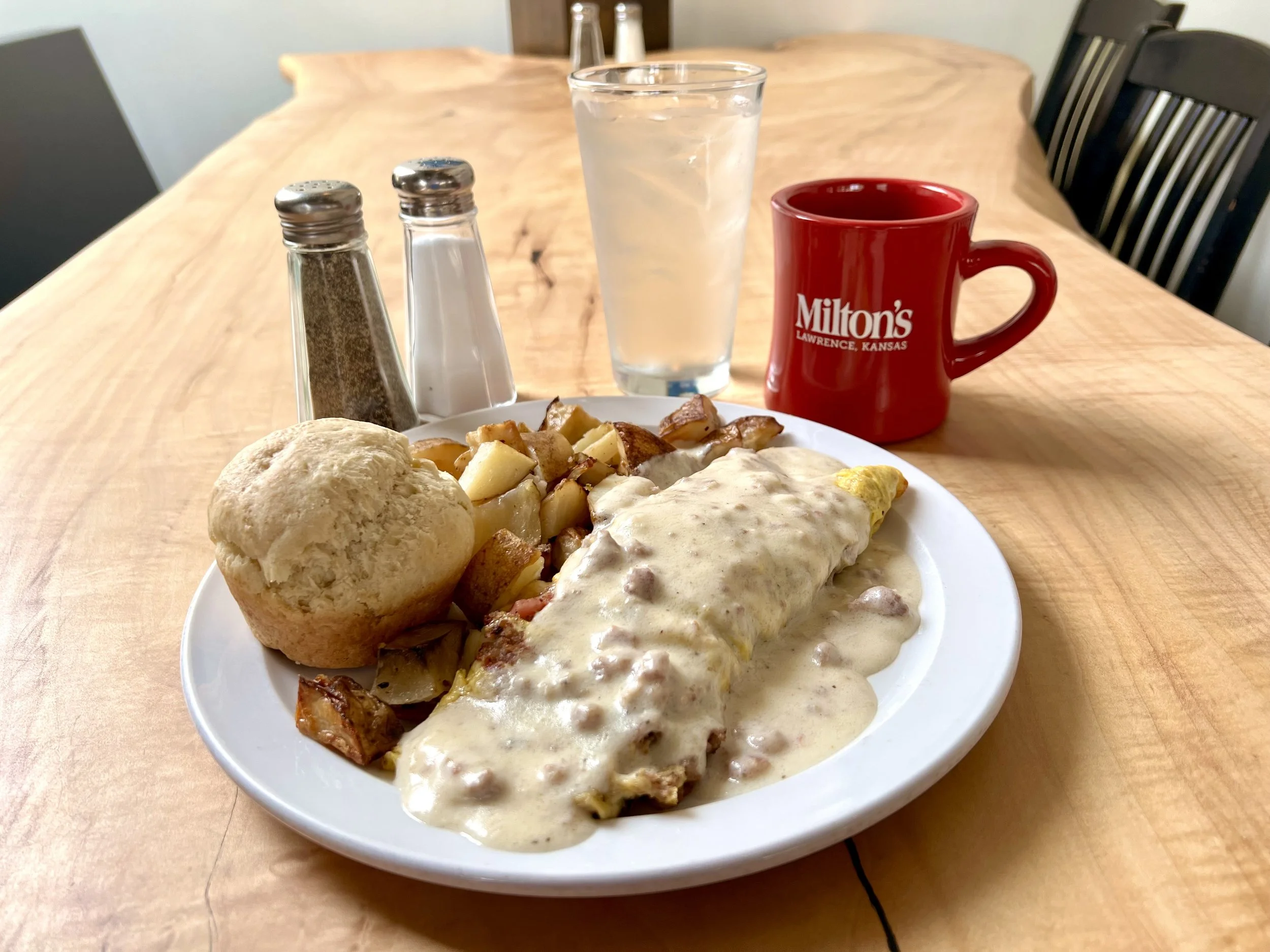 Features a generous filling of sausage, ham, cheese, red pepper, red onion, and crispy bacon, accompanied by homestyle potatoes and toast with rich gravy.