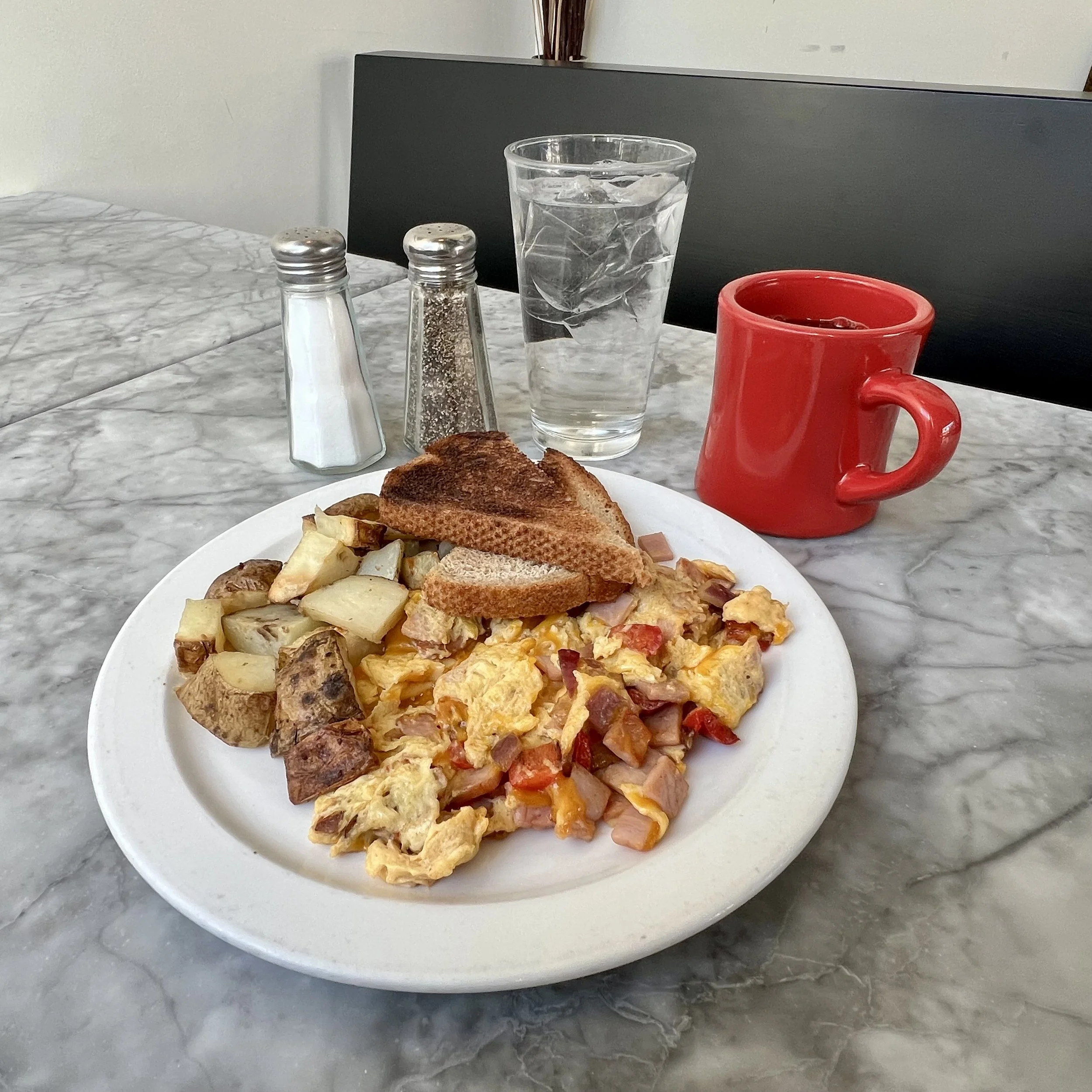 A substantial breakfast of two eggs served alongside diced ham, sautéed onions and red peppers, homestyle potatoes, and toast.